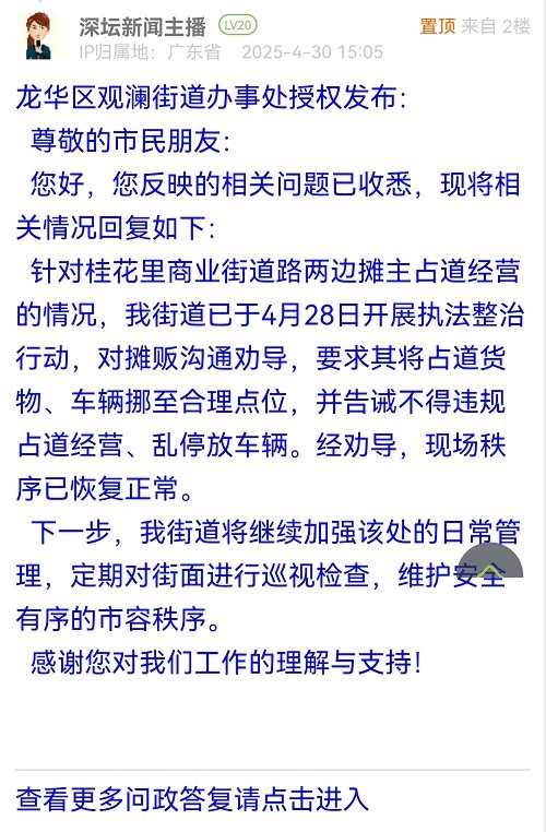 據(jù)統(tǒng)計(jì),2025年4月28日-2025年5月4日,網(wǎng)友在深圳論壇發(fā)布問政類帖文共31篇,得到相關(guān)單位正式回應(yīng)的帖文數(shù)為27篇,本期簡(jiǎn)報(bào)回應(yīng)速度最快的單位:龍華區(qū)觀瀾街道辦事處。