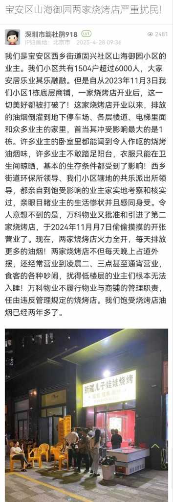 2. 帖文《寶安區(qū)山海御園兩家燒烤店嚴(yán)重?cái)_民!》
