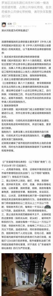 14. 帖文《羅湖區(qū)泥崗東路紅崗東村10棟一樓違規(guī)搭建雨棚,占用公共綠化用地,投農(nóng)藥催殺公共綠化帶樹植,請(qǐng)盡快采取整治行動(dòng)》