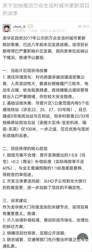 10. 帖文《關(guān)于加快推動(dòng)萬眾生活村城市更新項(xiàng)目的訴求》