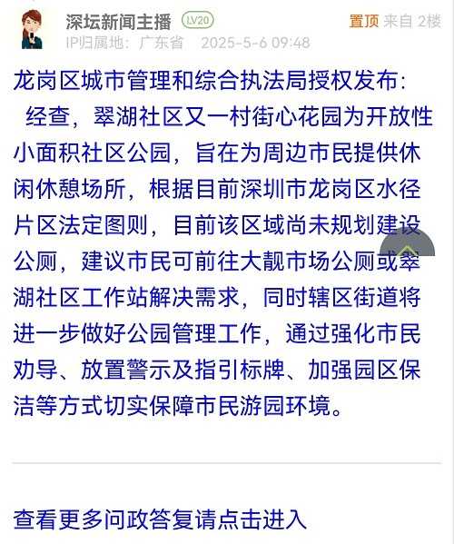 經(jīng)查,翠湖社區(qū)又一村街心花園為開放性小面積社區(qū)公園,旨在為周邊市民提供休閑休憩場(chǎng)所,根據(jù)目前深圳市龍崗區(qū)水徑片區(qū)法定圖則,目前該區(qū)域尚未規(guī)劃建設(shè)公廁,建議市民可前往大靚市場(chǎng)公廁或翠湖社區(qū)工作站解決需求,同時(shí)轄區(qū)街道將進(jìn)一步做好公園管理工作,通過強(qiáng)化市民勸導(dǎo)、放置警示及指引標(biāo)牌、加強(qiáng)園區(qū)保潔等方式切實(shí)保障市民游園環(huán)境。