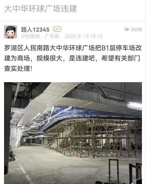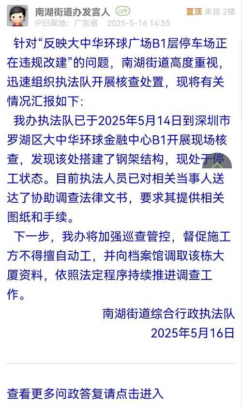 針對“反映大中華環(huán)球廣場B1層停車場正在違規(guī)改建”的問題,南湖街道高度重視,迅速組織執(zhí)法隊開展核查處置,現(xiàn)將有關(guān)情況匯報如下:我辦執(zhí)法隊已于2025年5月14日到深圳市羅湖區(qū)大中華環(huán)球金融中心B1開展現(xiàn)場核查,發(fā)現(xiàn)該處搭建了鋼架結(jié)構(gòu),現(xiàn)處于停工狀態(tài)。目前執(zhí)法人員已對相關(guān)當事人送達了協(xié)助調(diào)查法律文書,要求其提供相關(guān)圖紙和手續(xù)。下一步,我辦將加強巡查管控,督促施工方不得擅自動工,并向檔案館調(diào)取該棟大廈資料,依照法定程序持續(xù)推進調(diào)查工作。