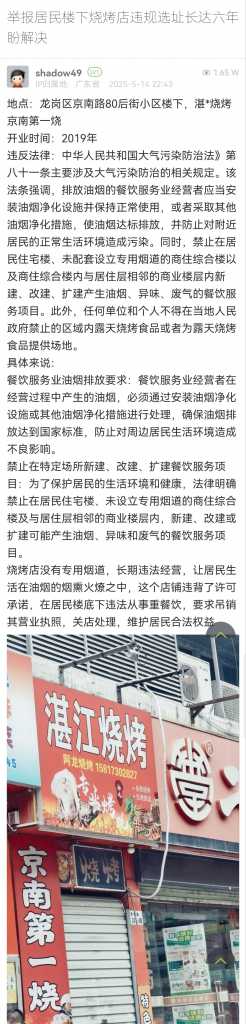 13. 帖文《舉報居民樓下燒烤店違規(guī)選址長達六年盼解決》