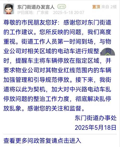 尊敬的市民朋友您好:感謝您對東門街道的工作建議。您所反映的問題,我們高度重視。街道工作人員第一時間到場,與物業(yè)公司對相關(guān)區(qū)域的電動車進行規(guī)整。同時,提醒車主將車輛停放在指定區(qū)域,并要求物業(yè)公司對其物業(yè)紅線范圍內(nèi)的車輛加強管理和引導規(guī)范停放。接下來,我街道將以此為契機,加大對中興路電動車亂停放問題的整治工作力度,徹底解決亂停放亂象。感謝您的關(guān)注和監(jiān)督。