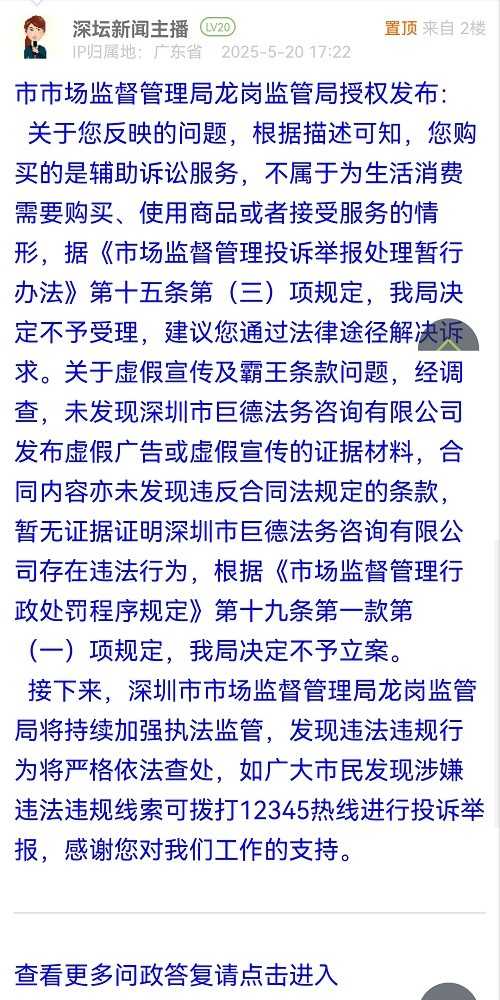 關(guān)于您反映的問題,根據(jù)描述可知,您購買的是輔助訴訟服務,不屬于為生活消費需要購買、使用商品或者接受服務的情形,據(jù)《市場監(jiān)督管理投訴舉報處理暫行辦法》第十五條第(三)項規(guī)定,我局決定不予受理,建議您通過法律途徑解決訴求。關(guān)于虛假宣傳及霸王條款問題,經(jīng)調(diào)查,未發(fā)現(xiàn)深圳市巨德法務咨詢有限公司發(fā)布虛假廣告或虛假宣傳的證據(jù)材料,合同內(nèi)容亦未發(fā)現(xiàn)違反合同法規(guī)定的條款,暫無證據(jù)證明深圳市巨德法務咨詢有限公司存在違法行為,根據(jù)《市場監(jiān)督管理行政處罰程序規(guī)定》第十九條第一款第(一)項規(guī)定,我局決定不予立案。接下來,深圳市市場監(jiān)督管理局龍崗監(jiān)管局將持續(xù)加強執(zhí)法監(jiān)管,發(fā)現(xiàn)違法違規(guī)行為將嚴格依法查處,如廣大市民發(fā)現(xiàn)涉嫌違法違規(guī)線索可撥打12345熱線進行投訴舉報,感謝您對我們工作的支持。