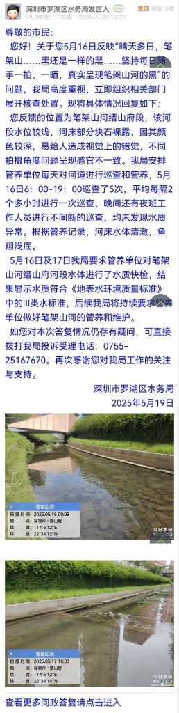 您反饋的位置為筆架山河縉山府段,該河段水位較淺,河床部分塊石裸露,因其顏色較深,易給人造成視覺上的錯覺,不同拍攝角度問題呈現(xiàn)感官不一致。我局安排管養(yǎng)單位每天對河道進行巡查和管養(yǎng),5月16日6:00-19:00巡查了5次,平均每隔2個多小時進行一次巡查,晚間還有夜班工作人員進行不間斷的巡查,均未發(fā)現(xiàn)水質(zhì)異常。根據(jù)管養(yǎng)記錄,河床水體清澈,魚翔淺底。