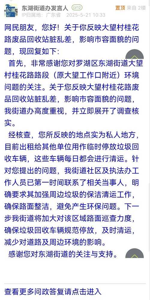 網(wǎng)民朋友,您好!關(guān)于你反映大望村桂花路廢品回收站臟亂差,影響市容面貌的問題,現(xiàn)回復如下:首先,非常感謝您對羅湖區(qū)東湖街道大望村桂花路路段(原大望工作口附近)環(huán)境問題的關(guān)注。關(guān)于您反映大望村桂花路廢品回收站臟亂差,影響市容面貌的問題,我街道辦高度重視,并立即展開了調(diào)查核實。經(jīng)核查,您所反映的地點實為私人地方,目前出租給其他單位用作臨時停放垃圾回收車輛,這些車輛每日都會進行清運。針對您提出的問題,我街道社區(qū)及執(zhí)法辦工作人員已第一時間聯(lián)系了相關(guān)當事人,明確要求其加強周邊垃圾的保潔清運工作,確保路面整潔,避免產(chǎn)生環(huán)保問題。下一步我街道將加大對該區(qū)域路面巡查力度,確保垃圾回收車輛規(guī)范停放,及時清運,減少對道路及周邊環(huán)境的影響。感謝您對東湖街道的關(guān)注與支持。