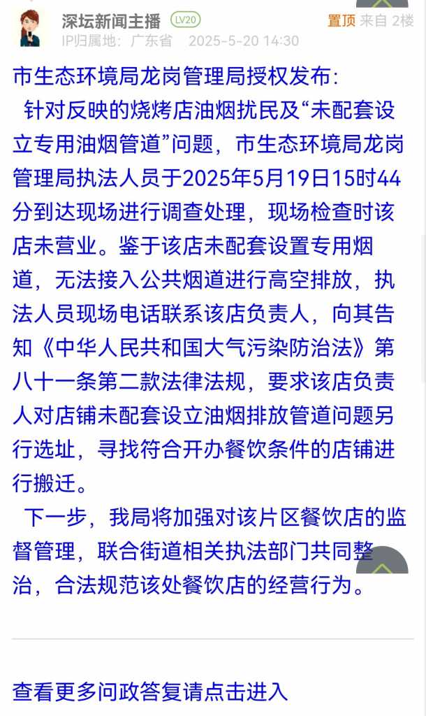 針對反映的燒烤店油煙擾民及“未配套設立專用油煙管道”問題,市生態(tài)環(huán)境局龍崗管理局執(zhí)法人員于2025年5月19日15時44分到達現(xiàn)場進行調(diào)查處理,現(xiàn)場檢查時該店未營業(yè)。鑒于該店未配套設置專用煙道,無法接入公共煙道進行高空排放,執(zhí)法人員現(xiàn)場電話聯(lián)系該店負責人,向其告知《中華人民共和國大氣污染防治法》第八十一條第二款法律法規(guī),要求該店負責人對店鋪未配套設立油煙排放管道問題另行選址,尋找符合開辦餐飲條件的店鋪進行搬遷。下一步,我局將加強對該片區(qū)餐飲店的監(jiān)督管理,聯(lián)合街道相關(guān)執(zhí)法部門共同整治,合法規(guī)范該處餐飲店的經(jīng)營行為。