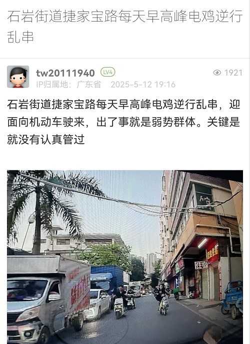 1. 帖文《石巖街道捷家寶路每天早高峰電雞逆行亂串》
