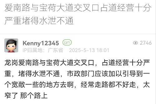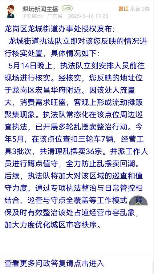 您反映的問題涉及龍城和龍崗兩個街道,2025年以來,龍城街道綜合行政執(zhí)法隊和龍崗街道綜合行政執(zhí)法隊針對違規(guī)占道經(jīng)營行為持續(xù)開展常態(tài)化整治行動,取得一定整治成效。當前受經(jīng)濟形勢下行影響,擺攤?cè)后w增多,占道經(jīng)營問題較突出,易回潮,普遍存在“整治—返潮—再整治”的情況。城管部門堅持規(guī)范文明執(zhí)法、柔性執(zhí)法,對第一次發(fā)現(xiàn)的流動攤販以勸離和宣傳法規(guī)為主,對屢教不改、拒不改正的違規(guī)占道經(jīng)營行為嚴格執(zhí)法查處。