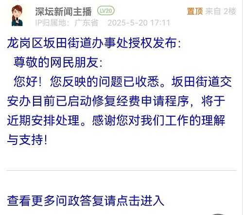 尊敬的網(wǎng)民朋友:您好!您反映的問題已收悉。坂田街道交安辦目前已啟動修復經(jīng)費申請程序,將于近期安排處理。感謝您對我們工作的理解與支持!