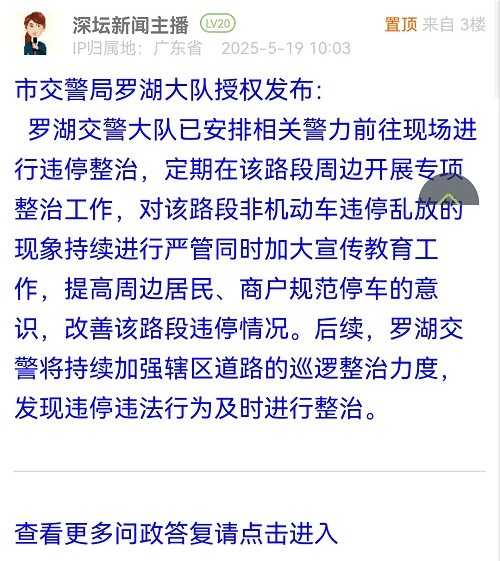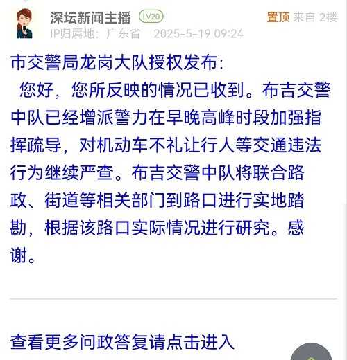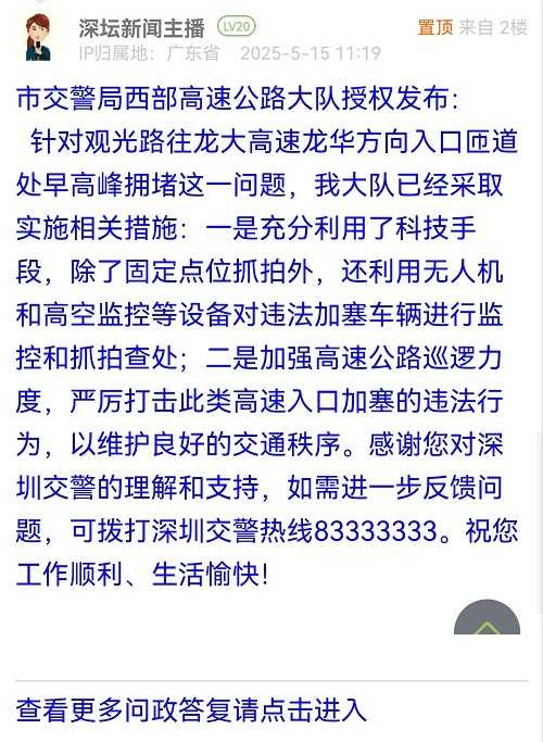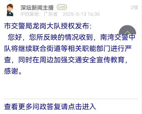 據(jù)統(tǒng)計,2025年5月12日-2025年5月18日,網(wǎng)友在深圳論壇發(fā)布問政類帖文共29篇,得到相關(guān)單位正式回應的帖文數(shù)為26篇,本期簡報回應速度最快的單位:市交警局龍崗大隊、市交警局西部高速公路大隊。