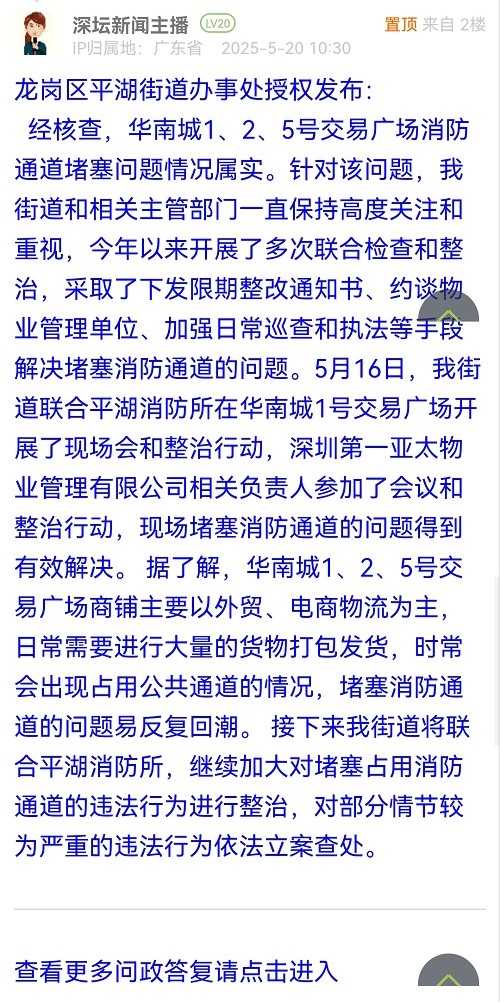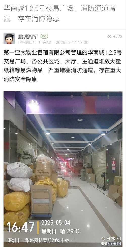 經(jīng)核查,華南城1、2、5號交易廣場消防通道堵塞問題情況屬實。針對該問題,我街道和相關(guān)主管部門一直保持高度關(guān)注和重視,今年以來開展了多次聯(lián)合檢查和整治,采取了下發(fā)限期整改通知書、約談物業(yè)管理單位、加強日常巡查和執(zhí)法等手段解決堵塞消防通道的問題。5月16日,我街道聯(lián)合平湖消防所在華南城1號交易廣場開展了現(xiàn)場會和整治行動,深圳第一亞太物業(yè)管理有限公司相關(guān)負責人參加了會議和整治行動,現(xiàn)場堵塞消防通道的問題得到有效解決。 據(jù)了解,華南城1、2、5號交易廣場商鋪主要以外貿(mào)、電商物流為主,日常需要進行大量的貨物打包發(fā)貨,時常會出現(xiàn)占用公共通道的情況,堵塞消防通道的問題易反復回潮。 接下來我街道將聯(lián)合平湖消防所,繼續(xù)加大對堵塞占用消防通道的違法行為進行整治,對部分情節(jié)較為嚴重的違法行為依法立案查處。