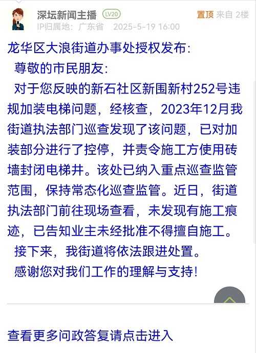 尊敬的市民朋友:對于您反映的新石社區(qū)新圍新村252號違規(guī)加裝電梯問題,經(jīng)核查,2023年12月我街道執(zhí)法部門巡查發(fā)現(xiàn)了該問題,已對加裝部分進行了控停,并責令施工方使用磚墻封閉電梯井。該處已納入重點巡查監(jiān)管范圍,保持常態(tài)化巡查監(jiān)管。近日,街道執(zhí)法部門前往現(xiàn)場查看,未發(fā)現(xiàn)有施工痕跡,已告知業(yè)主未經(jīng)批準不得擅自施工。接下來,我街道將依法跟進處置。感謝您對我們工作的理解與支持!