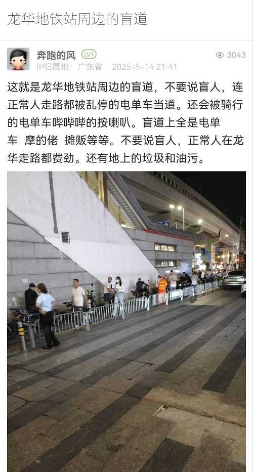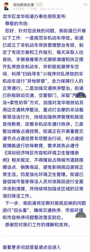 尊敬的市民:您好,針對您反映的問題,我街道已開展以下工作:一是規(guī)范非機動車停放。街道已成立了非機動車停放管理整治專班,制定了專項方案和工作指引,每天采取人拉肩抗、手挪身推等方式挪移清理和扶正擺齊亂停放非機動車,并積極拓展停車空間,利用“掃碼尋車”小程序?qū)y停放的非機動車進行“異地移管”,全力保障行人的正常通行。二是加強交通秩序整治。街道已積極聯(lián)動交通、交警部門,采取“嚴格執(zhí)法+柔性勸導”方式,加強對龍華地鐵站及周邊交通秩序整治,重點打擊摩的非法載客等違法行為,持續(xù)加強秩序管理和居民宣傳教育,改善非機動車通行秩序。三是整治攤販占道經(jīng)營。街道正在開展重要交通節(jié)點占道經(jīng)營專項整治行動,對占道經(jīng)營攤販進行勸導教育,要求其務必遵守《深圳經(jīng)濟特區(qū)市容和環(huán)境衛(wèi)生管理條例》相關(guān)規(guī)定,不得擅自占用城市道路擺攤設點、銷售商品,避免影響周邊居民正常生活。四是強化環(huán)境衛(wèi)生管理。街道已督促城市管家保潔人員對該路段進行全面沖洗和清理,并持續(xù)將加強該區(qū)域的日常清掃保潔工作。下一步,我街道將定期對居民反映的問題進行“回頭看”,確保交通秩序、市容環(huán)境和市容秩序問題整改落實到位。感謝您對我們工作的理解和支持。