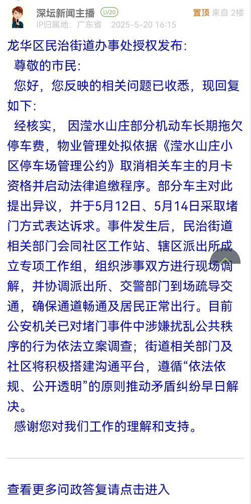 尊敬的市民:您好,您反映的相關(guān)問題已收悉,現(xiàn)回復如下:經(jīng)核實,因瀅水山莊部分機動車長期拖欠停車費,物業(yè)管理處擬依據(jù)《瀅水山莊小區(qū)停車場管理公約》取消相關(guān)車主的月卡資格并啟動法律追繳程序。部分車主對此提出異議,并于5月12日、5月14日采取堵門方式表達訴求。事件發(fā)生后,民治街道相關(guān)部門會同社區(qū)工作站、轄區(qū)派出所成立專項工作組,組織涉事雙方進行現(xiàn)場調(diào)解,并協(xié)調(diào)派出所、交警部門到場疏導交通,確保通道暢通及居民正常出行。目前公安機關(guān)已對堵門事件中涉嫌擾亂公共秩序的行為依法立案調(diào)查;街道相關(guān)部門及社區(qū)將積極搭建溝通平臺,遵循“依法依規(guī)、公開透明”的原則推動矛盾糾紛早日解決。感謝您對我們工作的理解和支持。