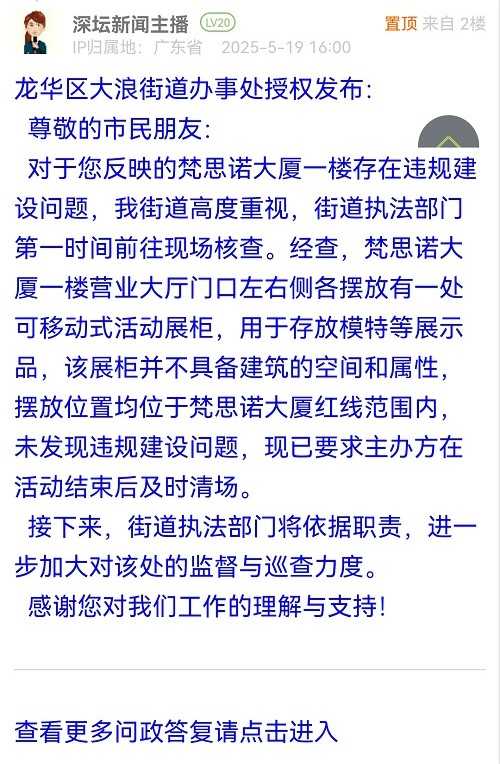 尊敬的市民朋友:對于您反映的梵思諾大廈一樓存在違規(guī)建設問題,我街道高度重視,街道執(zhí)法部門第一時間前往現(xiàn)場核查。經(jīng)查,梵思諾大廈一樓營業(yè)大廳門口左右側(cè)各擺放有一處可移動式活動展柜,用于存放模特等展示品,該展柜并不具備建筑的空間和屬性,擺放位置均位于梵思諾大廈紅線范圍內(nèi),未發(fā)現(xiàn)違規(guī)建設問題,現(xiàn)已要求主辦方在活動結(jié)束后及時清場。接下來,街道執(zhí)法部門將依據(jù)職責,進一步加大對該處的監(jiān)督與巡查力度。感謝您對我們工作的理解與支持!
