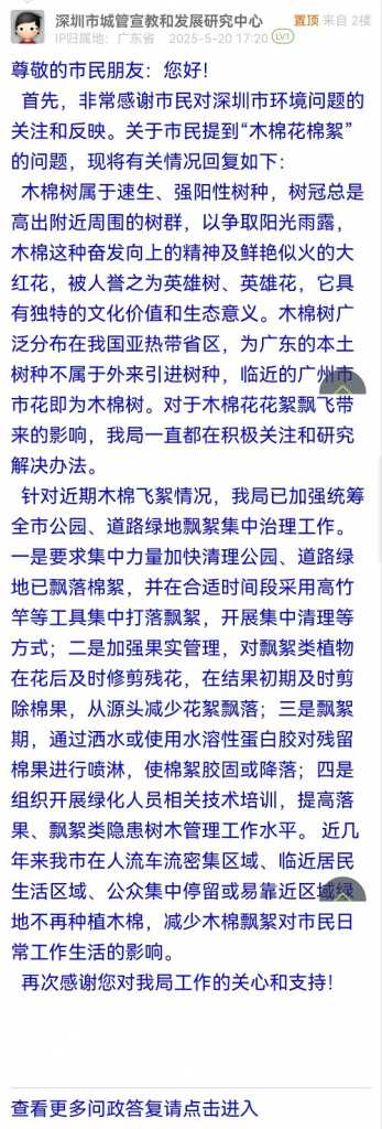 首先,非常感謝市民對深圳市環(huán)境問題的關(guān)注和反映。關(guān)于市民提到“木棉花棉絮”的問題,現(xiàn)將有關(guān)情況回復如下: