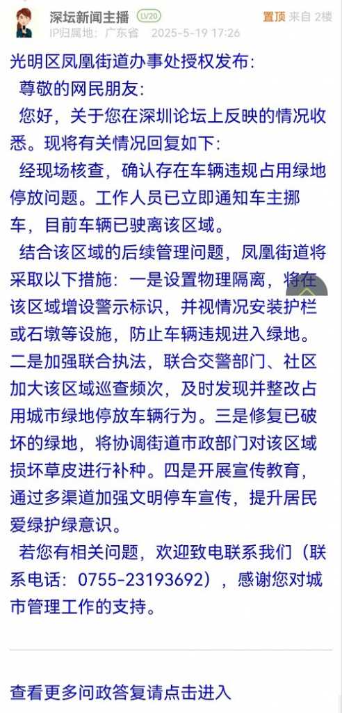 尊敬的網(wǎng)民朋友:您好,關(guān)于您在深圳論壇上反映的情況收悉?,F(xiàn)將有關(guān)情況回復如下:經(jīng)現(xiàn)場核查,確認存在車輛違規(guī)占用綠地停放問題。工作人員已立即通知車主挪車,目前車輛已駛離該區(qū)域。結(jié)合該區(qū)域的后續(xù)管理問題,鳳凰街道將采取以下措施:一是設置物理隔離,將在該區(qū)域增設警示標識,并視情況安裝護欄或石墩等設施,防止車輛違規(guī)進入綠地。二是加強聯(lián)合執(zhí)法,聯(lián)合交警部門、社區(qū)加大該區(qū)域巡查頻次,及時發(fā)現(xiàn)并整改占用城市綠地停放車輛行為。三是修復已破壞的綠地,將協(xié)調(diào)街道市政部門對該區(qū)域損壞草皮進行補種。四是開展宣傳教育,通過多渠道加強文明停車宣傳,提升居民愛綠護綠意識。若您有相關(guān)問題,歡迎致電聯(lián)系我們(聯(lián)系電話:0755-23193692),感謝您對城市管理工作的支持。