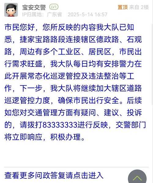 市民您好,您所反映的內(nèi)容我大隊已知悉,捷家寶路路段連接轄區(qū)德政路、石觀路,周邊有多個工業(yè)區(qū)、居民區(qū),市民出行需求旺盛,我大隊每日均有安排警力在此開展常態(tài)化巡邏管控及違法整治等工作,下一步,我大隊將繼續(xù)加大轄區(qū)道路巡邏管控力度,確保市民出行安全。后續(xù)如您對交通管理方面有疑問、建議、投訴的,請撥打83333333進行反映,交警部門將立即響應,積極辦理。