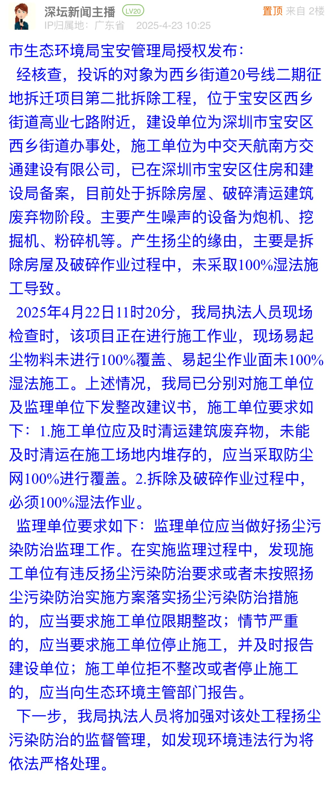 市民反映工地未落實降塵措施問題,直接關乎周邊環(huán)境質量,生態(tài)環(huán)境局寶安管理局快速響應,第一時間核查鎖定責任主體,明確施工與監(jiān)理單位整改要求,回應既及時又切中要害。從問題反饋到措施落地的全流程,體現(xiàn)了該局對市民訴求的高度重視,更展現(xiàn)出生態(tài)監(jiān)管部門“民有所呼、立行立改”的責任擔當,切實守護市民的呼吸安全。