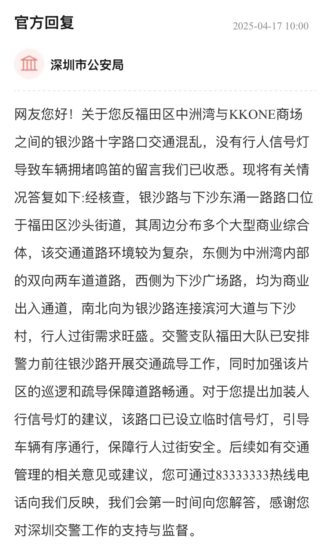 案例點評:商圈周邊商業(yè)密集、道路結構復雜,面對市民反映問題,市公安局交通警察局一方面安排警力現(xiàn)場疏導,另一方面根據(jù)實際情況,設立臨時信號燈,引導行人安全過街,車輛有序通行。雖未立即加裝固定信號燈,但該局以“應急處置、靈活調整”的務實方式解決燃眉之急,此類快速響應與因地制宜的處置模式,為商圈復雜路口交通管理提供范本。