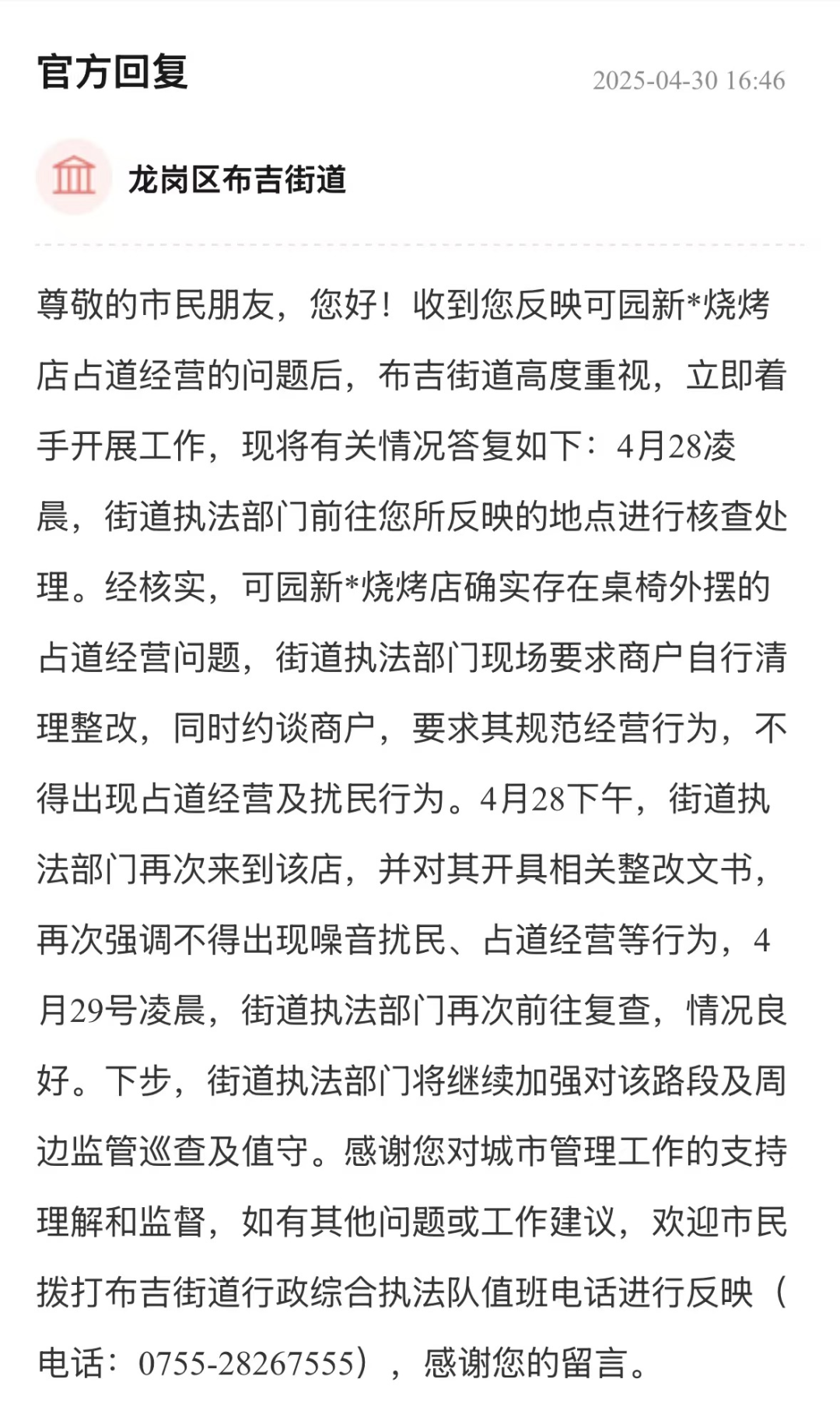 針對燒烤店占道經(jīng)營與凌晨噪音擾民問題,街道辦行動迅速,回應中處置流程清晰。在現(xiàn)場核查確認違規(guī)事實后,街道辦開具整改文書,開展復查、加強周邊監(jiān)管,解決商業(yè)經(jīng)營店鋪擾民問題,以規(guī)范行動守護居民“寧靜權”,展現(xiàn)了基層執(zhí)法的高效務實,切實提升了群眾生活幸福感。