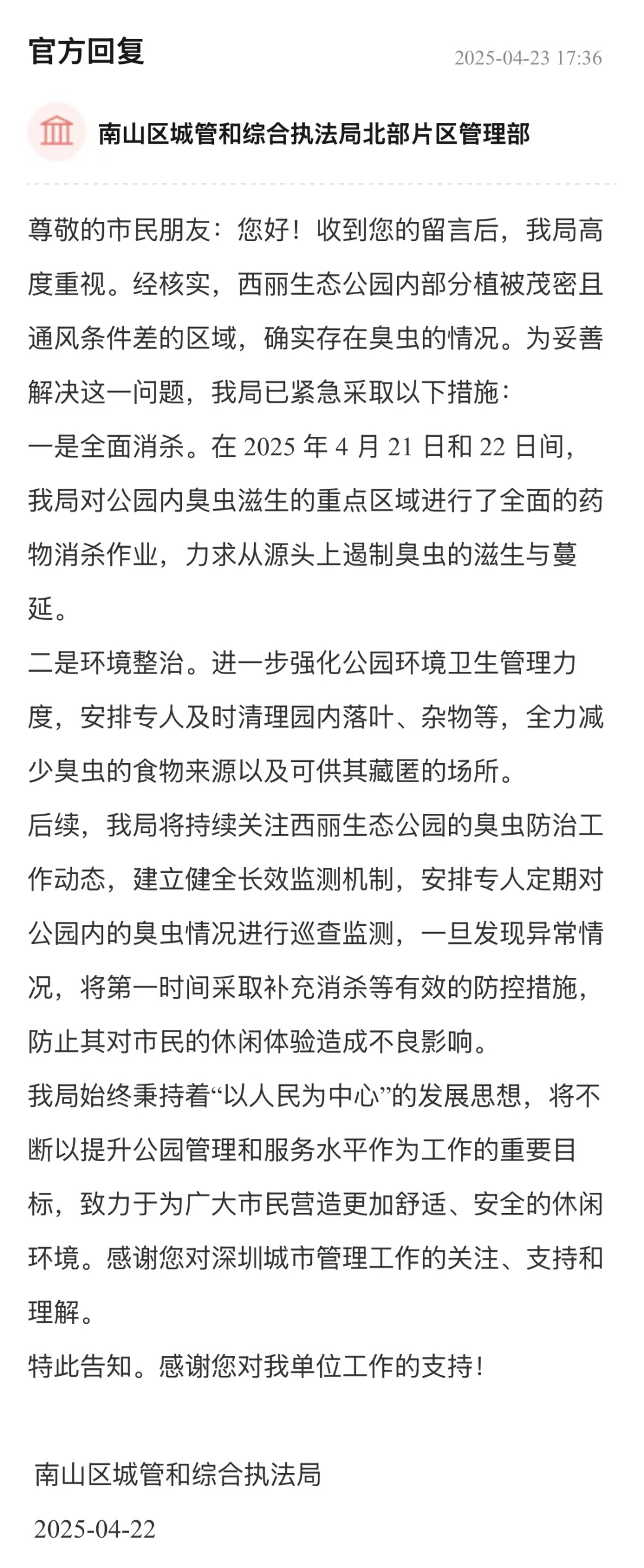案例點評:臭蟲侵擾住戶問題與居民生活舒適度息息相關。南山區(qū)城管部門快速響應,在問題反饋后48小時內(nèi)即開展消殺,遏制臭蟲蔓延;同步強化環(huán)境整治,切斷滋生鏈條。更值得肯定的是,回應中還表示將建立健全長效監(jiān)測機制,動態(tài)跟蹤蟲情并及時采取措施,充分體現(xiàn)出該局問題發(fā)現(xiàn)快、處置措施實、長效保障穩(wěn)的務實作風。