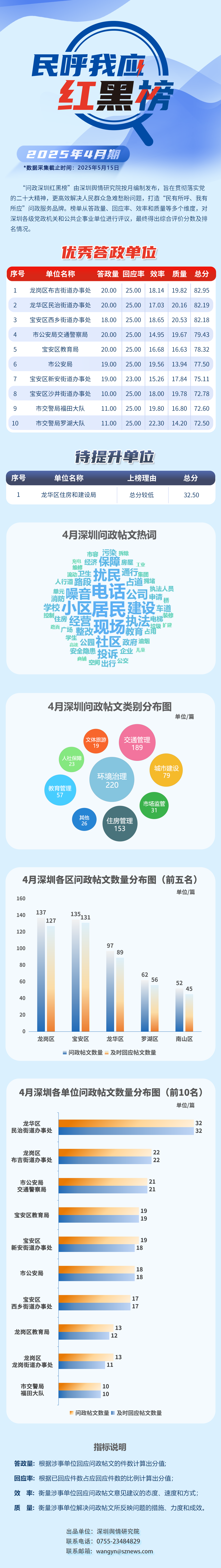 本期榜單采集的帖文主要來自深圳市及各區(qū)政府官網(wǎng)、深圳論壇、人民網(wǎng)領導留言板、深圳新聞網(wǎng)“民呼我應”等平臺,所采集帖文發(fā)布時間為2025年4月1日至4月30日,采集截止時間為2025年5月15日。