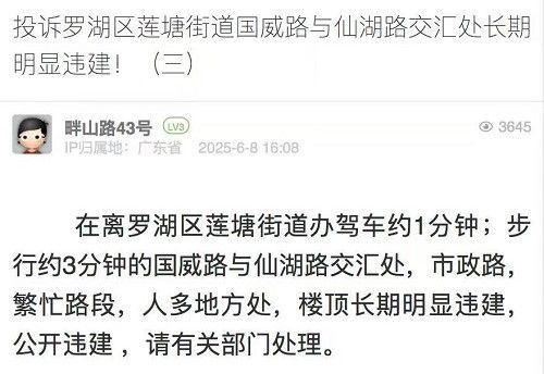 14. 帖文《投訴羅湖區(qū)蓮塘街道國(guó)威路與仙湖路交匯處長(zhǎng)期明顯違建!(三)》