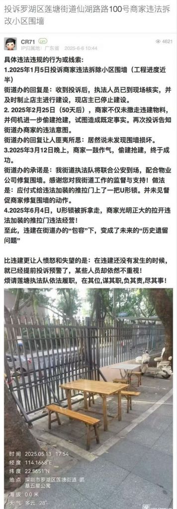 12. 帖文《投訴羅湖區(qū)蓮塘街道仙湖路路100號(hào)商家違法拆改小區(qū)圍墻》
