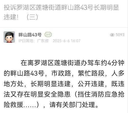 20. 帖文《投訴羅湖區(qū)蓮塘街道畔山路43號(hào)長(zhǎng)期明顯違建?。ㄈ?/span>》