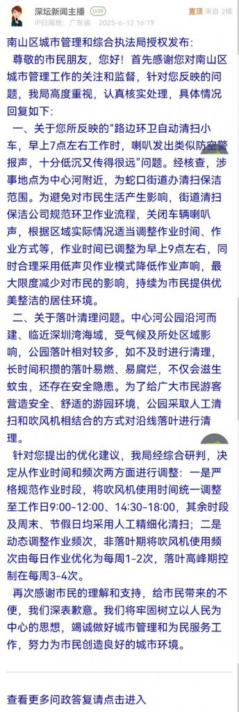 一、關(guān)于您所反映的“路邊環(huán)衛(wèi)自動(dòng)清掃小車(chē),早上7點(diǎn)左右工作時(shí),喇叭發(fā)出類(lèi)似防空警報(bào)聲,十分低沉又傳得很遠(yuǎn)”問(wèn)題。經(jīng)核查,涉事地點(diǎn)為中心河附近,為蛇口街道辦清掃保潔范圍。為避免對(duì)市民生活產(chǎn)生影響,街道清掃保潔公司規(guī)范環(huán)衛(wèi)作業(yè)流程,關(guān)閉車(chē)輛喇叭聲,根據(jù)區(qū)域?qū)嶋H情況適當(dāng)調(diào)整作業(yè)時(shí)間、作業(yè)方式等,作業(yè)時(shí)間已調(diào)整為早上9點(diǎn)左右,同時(shí)合理采用低聲貝作業(yè)模式降低作業(yè)聲響,最大限度減少對(duì)市民的影響,持續(xù)為市民提供優(yōu)美整潔的居住環(huán)境。