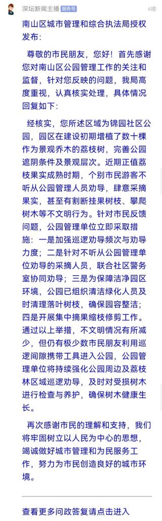 尊敬的市民朋友,您好!首先感謝您對(duì)南山區(qū)公園管理工作的關(guān)注和監(jiān)督,針對(duì)您反映的問(wèn)題,我局高度重視,認(rèn)真核實(shí)處理,具體情況回復(fù)如下:經(jīng)核實(shí),您所述區(qū)域?yàn)殄\園社區(qū)公園,園區(qū)在建設(shè)初期增植了數(shù)十棵作為景觀(guān)喬木的荔枝樹(shù),完善公園遮陰條件及景觀(guān)層次。近期正值荔枝果實(shí)成熟時(shí)期,個(gè)別市民游客不聽(tīng)從公園管理人員勸導(dǎo),肆意采摘果實(shí),甚至有割斷掛果樹(shù)枝、攀爬樹(shù)木等不文明行為。針對(duì)市民反饋問(wèn)題,公園管理單位立即采取措施:一是加強(qiáng)巡邏勸導(dǎo)頻次與勸導(dǎo)力度;二是針對(duì)不聽(tīng)從公園管理單位勸導(dǎo)的采摘人員,聯(lián)合社區(qū)警務(wù)室協(xié)同勸導(dǎo);三是為保障潔凈園區(qū)環(huán)境,公園已組織清潔綠化人員及時(shí)清理落葉樹(shù)枝,確保園容整潔;四是開(kāi)展集中摘果縮枝修剪工作。通過(guò)以上舉措,不文明情況有所減少,但仍有極少數(shù)市民朋友利用巡邏間隙攜帶工具進(jìn)入公園,公園管理單位將持續(xù)強(qiáng)化公園周邊及荔枝林區(qū)域巡邏勸導(dǎo),及時(shí)對(duì)受損樹(shù)木進(jìn)行檢查與養(yǎng)護(hù),確保樹(shù)木健康生長(zhǎng)。再次感謝市民的理解和支持,我們將牢固樹(shù)立以人民為中心的思想,竭誠(chéng)做好城市管理和為民服務(wù)工作,努力為市民創(chuàng)造良好的城市環(huán)境。