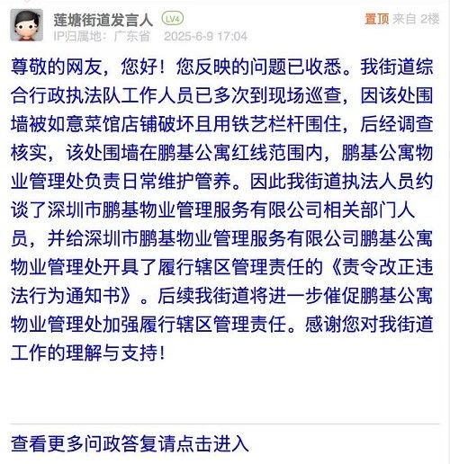 尊敬的網(wǎng)友,您好!您反映的問(wèn)題已收悉。我街道綜合行政執(zhí)法隊(duì)工作人員已多次到現(xiàn)場(chǎng)巡查,因該處圍墻被如意菜館店鋪破壞且用鐵藝欄桿圍住,后經(jīng)調(diào)查核實(shí),該處圍墻在鵬基公寓紅線(xiàn)范圍內(nèi),鵬基公寓物業(yè)管理處負(fù)責(zé)日常維護(hù)管養(yǎng)。因此我街道執(zhí)法人員約談了深圳市鵬基物業(yè)管理服務(wù)有限公司相關(guān)部門(mén)人員,并給深圳市鵬基物業(yè)管理服務(wù)有限公司鵬基公寓物業(yè)管理處開(kāi)具了履行轄區(qū)管理責(zé)任的《責(zé)令改正違法行為通知書(shū)》。后續(xù)我街道將進(jìn)一步催促鵬基公寓物業(yè)管理處加強(qiáng)履行轄區(qū)管理責(zé)任。感謝您對(duì)我街道工作的理解與支持!