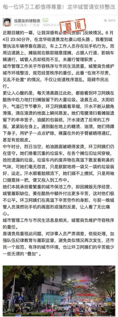 9. 帖文《每一位環(huán)衛(wèi)工都值得尊重!龍華城管請(qǐng)安排整改》