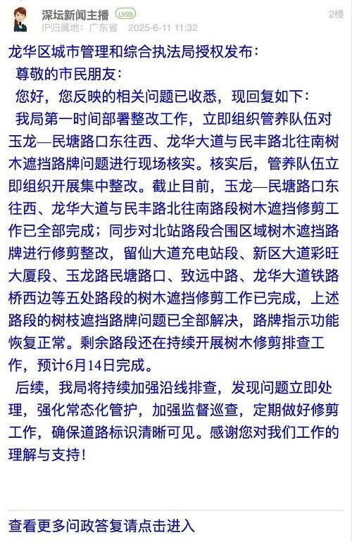 我局第一時(shí)間部署整改工作,立即組織管養(yǎng)隊(duì)伍對(duì)玉龍—民塘路口東往西、龍華大道與民豐路北往南樹(shù)木遮擋路牌問(wèn)題進(jìn)行現(xiàn)場(chǎng)核實(shí)。核實(shí)后,管養(yǎng)隊(duì)伍立即組織開(kāi)展集中整改。截止目前,玉龍—民塘路口東往西、龍華大道與民豐路北往南路段樹(shù)木遮擋修剪工作已全部完成;同步對(duì)北站路段合圍區(qū)域樹(shù)木遮擋路牌進(jìn)行修剪整改,留仙大道充電站段、新區(qū)大道彩旺大廈段、玉龍路民塘路口、致遠(yuǎn)中路、龍華大道鐵路橋西邊等五處路段的樹(shù)木遮擋修剪工作已完成,上述路段的樹(shù)枝遮擋路牌問(wèn)題已全部解決,路牌指示功能恢復(fù)正常。剩余路段還在持續(xù)開(kāi)展樹(shù)木修剪排查工作,預(yù)計(jì)6月14日完成。