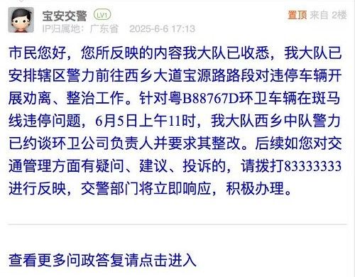 市民您好,您所反映的內(nèi)容我大隊(duì)已收悉,我大隊(duì)已安排轄區(qū)警力前往西鄉(xiāng)大道寶源路路段對(duì)違停車(chē)輛開(kāi)展勸離、整治工作。針對(duì)粵B88767D環(huán)衛(wèi)車(chē)輛在斑馬線(xiàn)違停問(wèn)題,6月5日上午11時(shí),我大隊(duì)西鄉(xiāng)中隊(duì)警力已約談環(huán)衛(wèi)公司負(fù)責(zé)人并要求其整改。后續(xù)如您對(duì)交通管理方面有疑問(wèn)、建議、投訴的,請(qǐng)撥打83333333進(jìn)行反映,交警部門(mén)將立即響應(yīng),積極辦理。