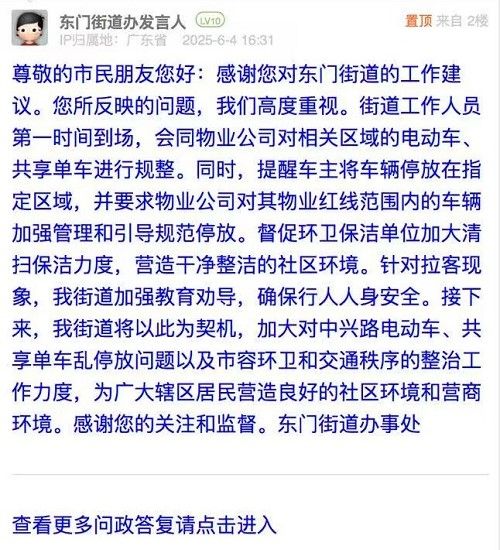 尊敬的市民朋友,您好。街道辦人員已將亂停放電動(dòng)車(chē)、三輪車(chē)規(guī)整入停車(chē)區(qū)域內(nèi),現(xiàn)場(chǎng)督促市場(chǎng)管理處及東門(mén)雅園物業(yè)管理處加強(qiáng)對(duì)轄區(qū)管理力度,安排人員督導(dǎo)商家、住戶(hù)規(guī)范停車(chē),維護(hù)好市場(chǎng)及市場(chǎng)周邊市容環(huán)境整潔。下步,街道將強(qiáng)化常態(tài)化巡查機(jī)制,加大對(duì)樂(lè)園路電動(dòng)車(chē)、共享單車(chē)亂停放問(wèn)題以及市容環(huán)衛(wèi)和交通秩序的整治工作力度,為廣大轄區(qū)居民營(yíng)造良好的社區(qū)環(huán)境和營(yíng)商環(huán)境。感謝您的關(guān)注和監(jiān)督。
