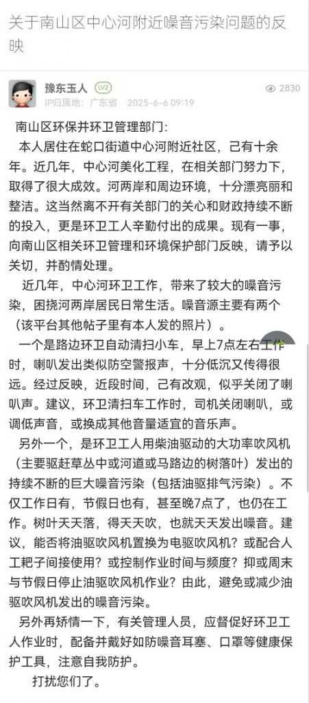 19. 帖文《關(guān)于南山區(qū)中心河附近噪音污染問(wèn)題的反映》