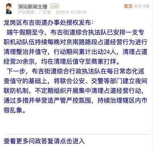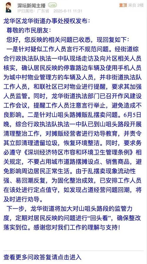 一是針對(duì)疑似工作人員言行不規(guī)范問(wèn)題。經(jīng)街道綜合行政執(zhí)法隊(duì)執(zhí)法一中隊(duì)現(xiàn)場(chǎng)走訪(fǎng)及向片區(qū)相關(guān)人員核實(shí),確認(rèn)居民反映的??柯愤呠?chē)輛及使用手機(jī)人員為城中村物業(yè)管理方的車(chē)輛及人員,并非街道執(zhí)法隊(duì)工作人員,和聯(lián)社區(qū)已對(duì)物業(yè)進(jìn)行提醒,要求其加強(qiáng)人員監(jiān)管。同時(shí),龍華街道執(zhí)法部門(mén)已召開(kāi)作風(fēng)建設(shè)工作會(huì)議,提醒工作人員注意言行舉止,避免造成不良影響。二是針對(duì)山咀頭路攤販亂擺賣(mài)問(wèn)題。6月5日晚,綜合行政執(zhí)法隊(duì)執(zhí)法一中隊(duì)已到山咀頭路段開(kāi)展清理整治工作,對(duì)攤販經(jīng)營(yíng)者進(jìn)行勸導(dǎo)教育,并責(zé)令其立即清理遺留垃圾,恢復(fù)環(huán)境整潔。同時(shí),要求務(wù)必遵守《深圳經(jīng)濟(jì)特區(qū)市容和環(huán)境衛(wèi)生管理?xiàng)l例》相關(guān)規(guī)定,不要占用城市道路擺攤設(shè)點(diǎn)、銷(xiāo)售商品,避免影響周邊居民正常生活。由于亂擺賣(mài)現(xiàn)象流動(dòng)性強(qiáng)、易回潮反復(fù),為固化整治成效,已安排工作人員在該處進(jìn)行定點(diǎn)值守,如發(fā)現(xiàn)占道經(jīng)營(yíng)問(wèn)題回潮,將及時(shí)進(jìn)行勸導(dǎo)。