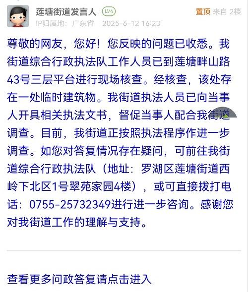尊敬的網(wǎng)友,您好!您反映的問(wèn)題已收悉。我街道綜合行政執(zhí)法隊(duì)工作人員已到蓮塘畔山路43號(hào)三層平臺(tái)進(jìn)行現(xiàn)場(chǎng)核查。經(jīng)核查,該處存在一處臨時(shí)建筑物。我街道執(zhí)法人員已向當(dāng)事人開(kāi)具相關(guān)執(zhí)法文書(shū),督促當(dāng)事人配合我街道調(diào)查。目前,我街道正按照?qǐng)?zhí)法程序作進(jìn)一步調(diào)查。如您對(duì)答復(fù)情況存在疑問(wèn),可前往我街道綜合行政執(zhí)法隊(duì)(地址:羅湖區(qū)蓮塘街道西嶺下北區(qū)1號(hào)翠苑家園4樓),或可直接撥打電話(huà):0755-25732349進(jìn)行進(jìn)一步咨詢(xún)。感謝您對(duì)我街道工作的理解與支持。