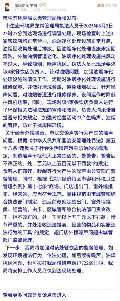市生態(tài)環(huán)境局龍崗管理局執(zhí)法人員于2025年6月3日23時(shí)25分到達(dá)現(xiàn)場(chǎng)進(jìn)行調(diào)查處理,現(xiàn)場(chǎng)檢查時(shí)上述4家餐飲店均正常營(yíng)業(yè),油煙凈化處理設(shè)施正常開(kāi)啟,油煙經(jīng)收集處理后排放。因油煙凈化處理設(shè)施未定期清洗,外加油煙管道老化、油煙凈化處理設(shè)施抽風(fēng)功率過(guò)大,導(dǎo)致油煙、噪聲擾民。執(zhí)法人員已現(xiàn)場(chǎng)要求該4家餐飲店負(fù)責(zé)人,針對(duì)油煙問(wèn)題,加強(qiáng)油煙凈化處理設(shè)施的清洗工作,定期對(duì)油煙凈化處理設(shè)施進(jìn)行維修保養(yǎng),并做好清洗臺(tái)賬,避免油煙擾民;針對(duì)噪聲問(wèn)題,對(duì)油煙管道進(jìn)行維修保養(yǎng),夜間運(yùn)作時(shí)降低抽風(fēng)機(jī)功率。同時(shí),現(xiàn)場(chǎng)對(duì)該4家餐飲店負(fù)責(zé)人進(jìn)行了環(huán)保相關(guān)法律法規(guī)的宣傳和教育,負(fù)責(zé)人均承諾自覺(jué)遵守相關(guān)規(guī)定,加強(qiáng)對(duì)經(jīng)營(yíng)活動(dòng)中產(chǎn)生噪聲、油煙的管控,防止干擾周?chē)h(huán)境。