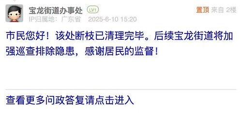 市民您好!該處斷枝已清理完畢。后續(xù)寶龍街道將加強(qiáng)巡查排除隱患,感謝居民的監(jiān)督!