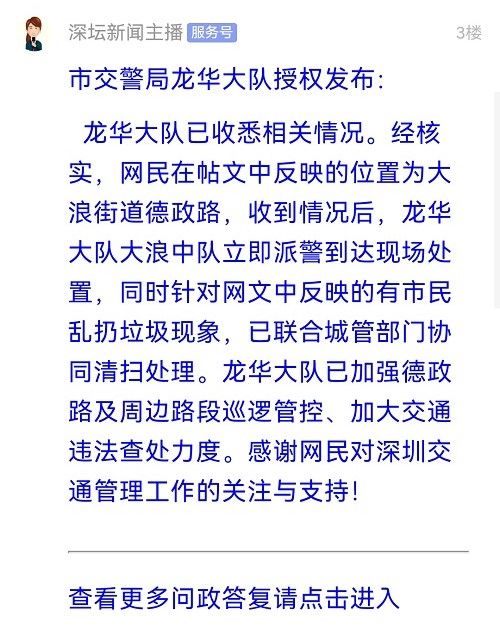 龍華大隊(duì)已收悉相關(guān)情況。經(jīng)核實(shí),網(wǎng)民在帖文中反映的位置為大浪街道德政路,收到情況后,龍華大隊(duì)大浪中隊(duì)立即派警到達(dá)現(xiàn)場(chǎng)處置,同時(shí)針對(duì)網(wǎng)文中反映的有市民亂扔垃圾現(xiàn)象,已聯(lián)合城管部門(mén)協(xié)同清掃處理。龍華大隊(duì)已加強(qiáng)德政路及周邊路段巡邏管控、加大交通違法查處力度。感謝網(wǎng)民對(duì)深圳交通管理工作的關(guān)注與支持!