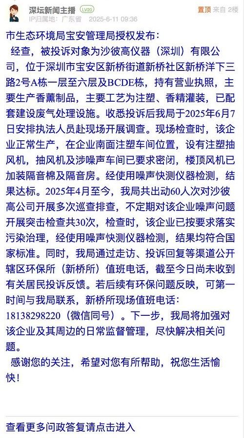 經(jīng)查,被投訴對(duì)象為沙彼高儀器(深圳)有限公司,位于深圳市寶安區(qū)新橋街道新橋社區(qū)新橋洋下三路2號(hào)A棟一層至六層及BCDE棟,持有營(yíng)業(yè)執(zhí)照,主要生產(chǎn)香薰制品,主要工藝為注塑、香精灌裝,已配套建設(shè)廢氣處理設(shè)施。收悉投訴后我局于2025年6月7日安排執(zhí)法人員赴現(xiàn)場(chǎng)開(kāi)展調(diào)查?,F(xiàn)場(chǎng)檢查時(shí),該企業(yè)正常生產(chǎn),在企業(yè)南面注塑車(chē)間位置,設(shè)有注塑抽風(fēng)機(jī),抽風(fēng)機(jī)及涉噪聲車(chē)間已要求密閉,樓頂風(fēng)機(jī)已加裝隔音棉及隔音房。經(jīng)使用噪聲快測(cè)儀器檢測(cè),結(jié)果達(dá)標(biāo)。2025年4月至今,我局共出動(dòng)60人次對(duì)沙彼高公司開(kāi)展多次巡查排查,不定期對(duì)該企業(yè)噪聲問(wèn)題開(kāi)展突擊檢查共30次,檢查時(shí),該企業(yè)已按要求落實(shí)污染治理,經(jīng)使用噪聲快測(cè)儀器檢測(cè),結(jié)果均符合國(guó)家標(biāo)準(zhǔn)。同時(shí),我局通過(guò)走訪(fǎng)、投訴回復(fù)等渠道公開(kāi)轄區(qū)環(huán)保所(新橋所)值班電話(huà),截至今日尚未收到有關(guān)居民投訴反饋。若后續(xù)有環(huán)保問(wèn)題反映,可第一時(shí)間與我局聯(lián)系,新橋所現(xiàn)場(chǎng)值班電話(huà):18138298220(微信同號(hào))。下一步,我局將加強(qiáng)對(duì)該企業(yè)及其周邊的日常監(jiān)督管理,盡快解決相關(guān)問(wèn)題。
