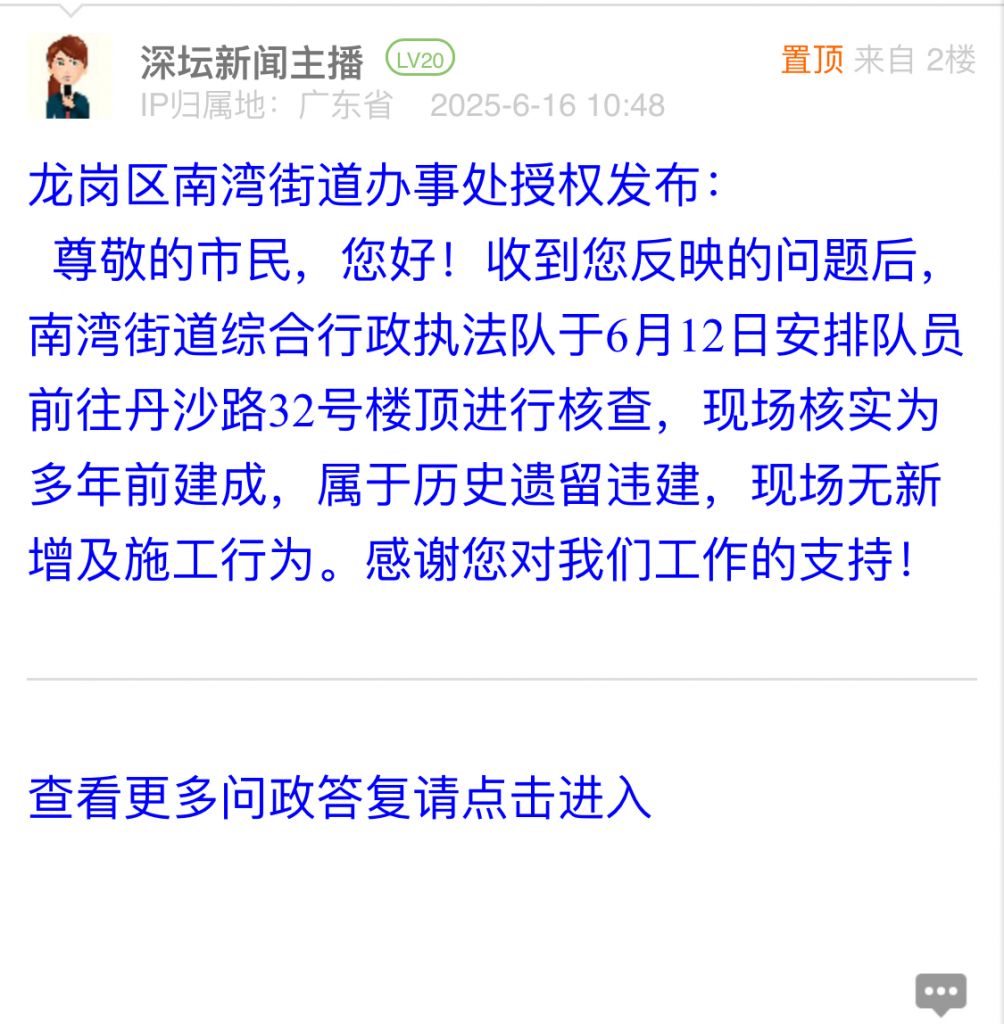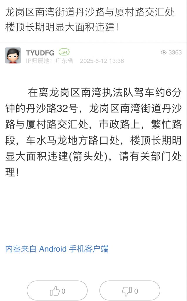 12. 帖文《龍崗區(qū)南灣街道丹沙路與廈村路交匯處樓頂長期明顯大面積違建!》