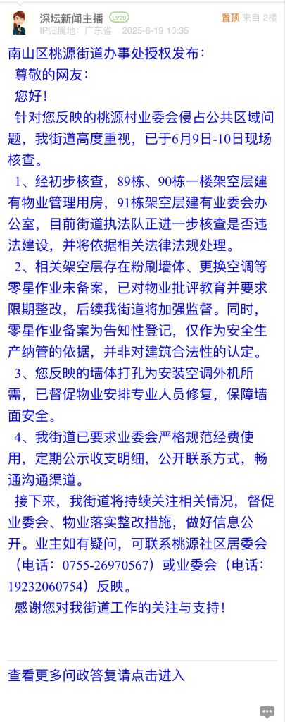 接下來,我街道將持續(xù)關(guān)注相關(guān)情況,業(yè)主如有疑問,可聯(lián)系桃源社區(qū)居委會(電話:0755-26970567)反映。