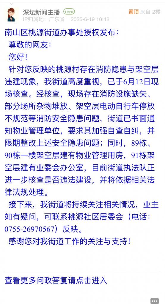 針對您反映的桃源村存在消防隱患與架空層違建現(xiàn)象,我街道高度重視,已于6月12日現(xiàn)場核查。經(jīng)核查,現(xiàn)場存在消防設(shè)施缺失、部分場所雜物堆放、架空層電動自行車停放不規(guī)范等消防安全隱患問題,街道已書面通知物業(yè)管理單位,要求其加強自查自糾,并限期整改上述安全隱患問題;同時,89棟、90棟一樓架空層建有物業(yè)管理用房,91棟架空層建有業(yè)委會辦公室,目前街道執(zhí)法隊正進一步核查是否違法建設(shè),并將依據(jù)相關(guān)法律法規(guī)處理。