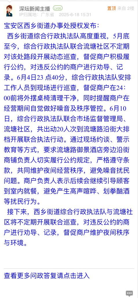 西鄉(xiāng)街道綜合行政執(zhí)法隊高度重視,5月底至今,綜合行政執(zhí)法隊聯(lián)合流塘社區(qū)不定期對該處路段開展動態(tài)巡查,督促商戶積極履行公約,對違反公約的商戶進行勸導(dǎo)、記錄。6月4日23 點40分,綜合行政執(zhí)法隊安排工作人員到現(xiàn)場進行巡查,督促商戶在24:00前將外擺桌椅清理干凈,同時提醒商戶在經(jīng)營期間自覺做好噪音及秩序管控。6月10日,綜合行政執(zhí)法隊聯(lián)合市場監(jiān)督管理局、流塘社區(qū),共出動20人次到流塘路沿街大排檔開展聯(lián)合執(zhí)法行動。通過現(xiàn)場約談、警示教育等方式,要求流塘路御景酒店旁邊沿街商鋪負責人切實履行公約規(guī)定,嚴格遵守條款,共同維護夜間經(jīng)營秩序,避免噪音擾民問題。商戶負責人表示后續(xù)會繼續(xù)引導(dǎo)顧客到室內(nèi)就餐,避免產(chǎn)生高聲喧嘩、劃拳酗酒等擾民行為。